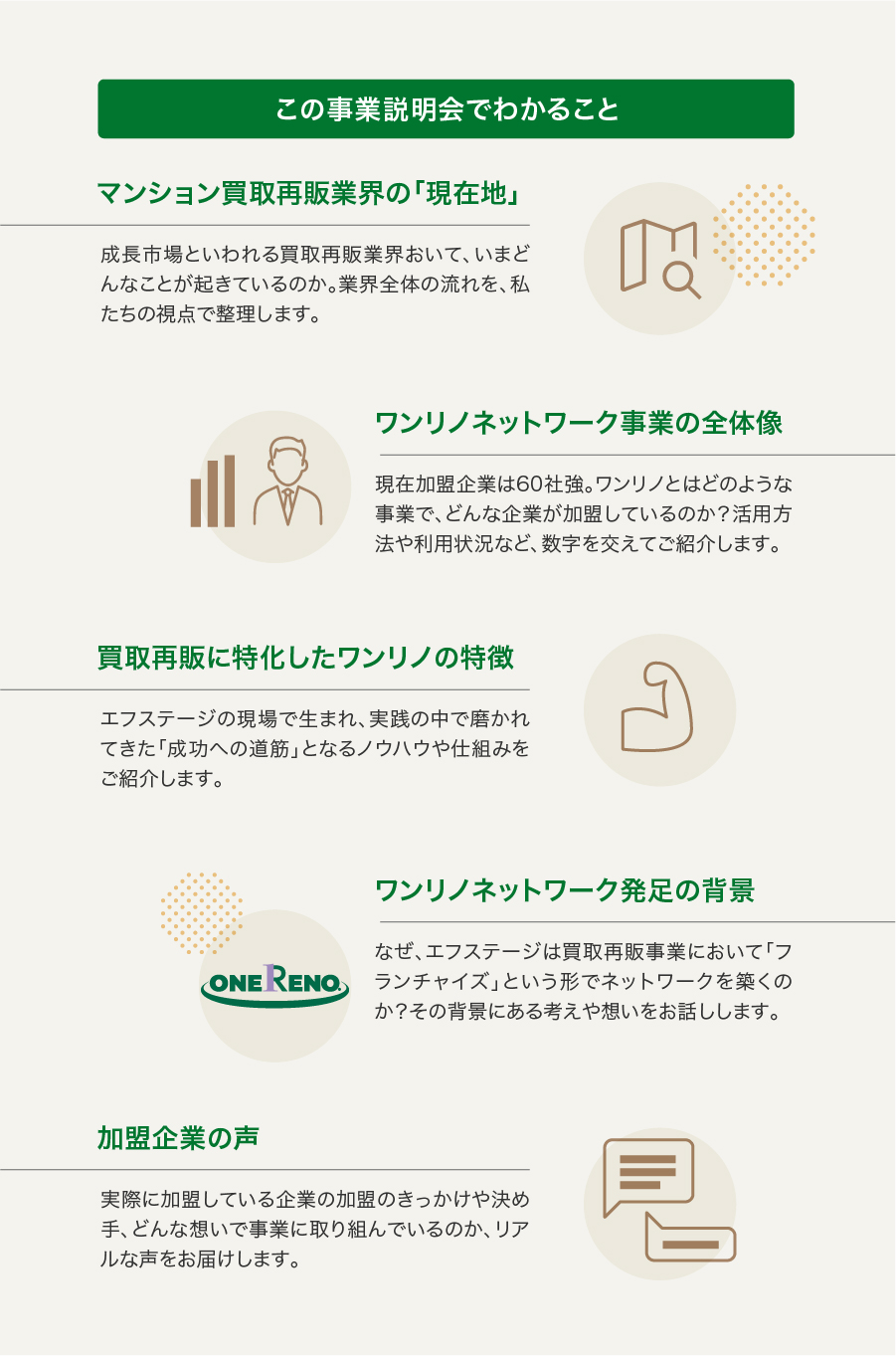 エフステージが展開するフランチャイズ事業「ワンリノネットワーク」について簡潔にご紹介します。 既に買取再販事業を行なっている、またはこれから買取再販事業を始めたい経営者様に向けて、 成功への道筋となる経営の考え方や手法など、ポイントを絞ってお伝えします。