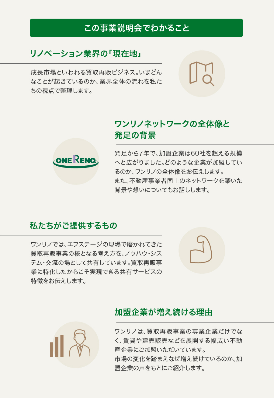 なぜ不動産事業者が続々とワンリノへ加盟しているのか?その背景には、市況の変化があります。本説明会ではその変化が、ワンリノにどう結びつくのかを紐解いていきます。